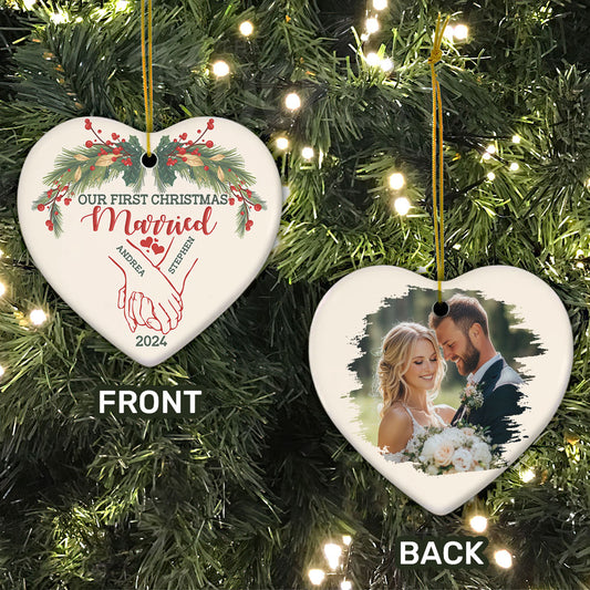 Holding Hands First Christmas Couple - Personalized Heart Shaped Ceramic Ornament DSHCOHLN2256TA