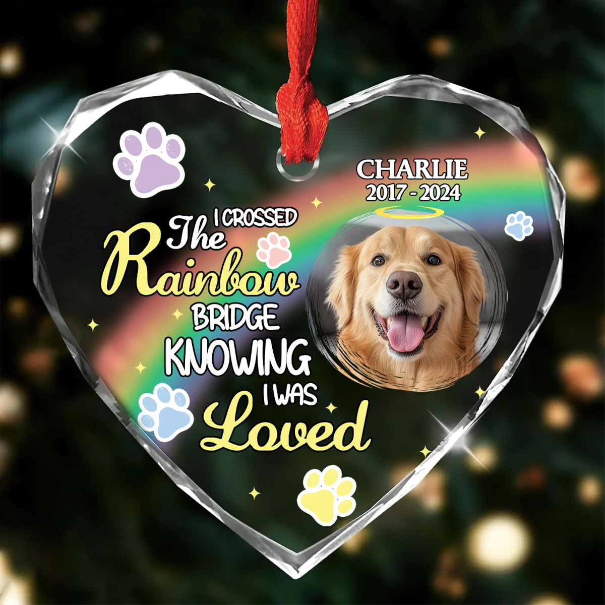 I Crossed The Rainbow Bridge Knowing I Was Loved - Personalized Heart Shaped Glass Ornament DSHGOHLPA2286L