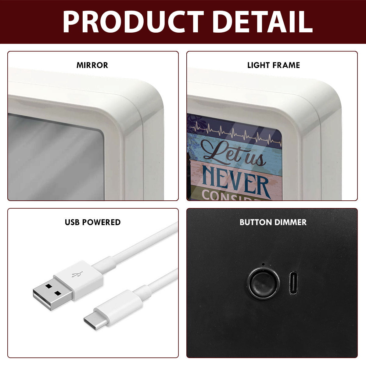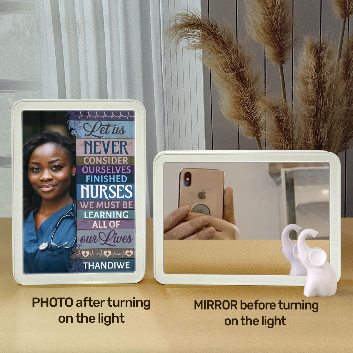 - Used as a mirror, photo frame and a lamp